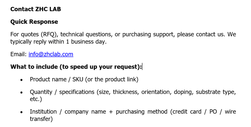 - Quantity / specifications (size, thickness, orientation, doping, substrate type, etc.)